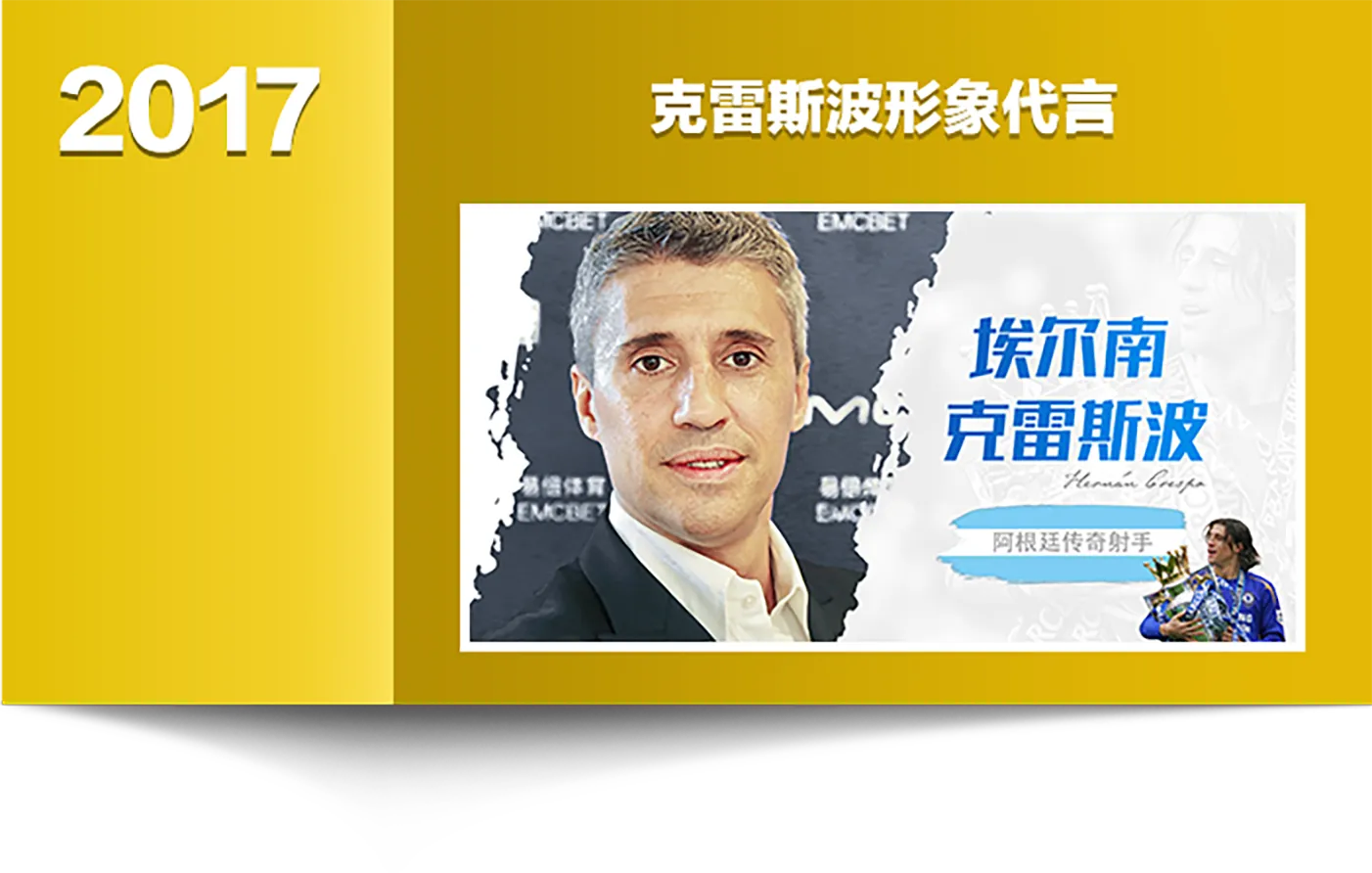 埃尔南·克雷斯波,19岁就荣获阿根廷联赛金靴奖,被誉为"天生的进球机器",门前嗅觉灵敏,射门技术精湛,身体强壮且善于控球,曾效力于帕尔马、拉齐奥、国际米兰、切尔西、AC米兰等欧洲强队,并代表阿根廷国家队出场64次打进35球。2017年8月12日,EMC易倍体育与阿根廷传奇射手,现任帕尔马副主席克雷斯波签约发布会于意大利米兰举行,潘帕斯之鹰正式结盟易倍体育,再续传奇。